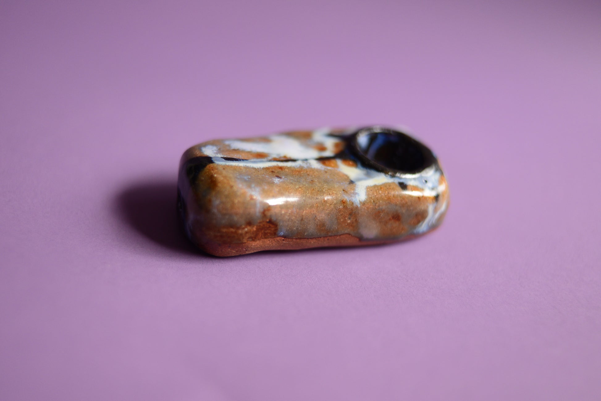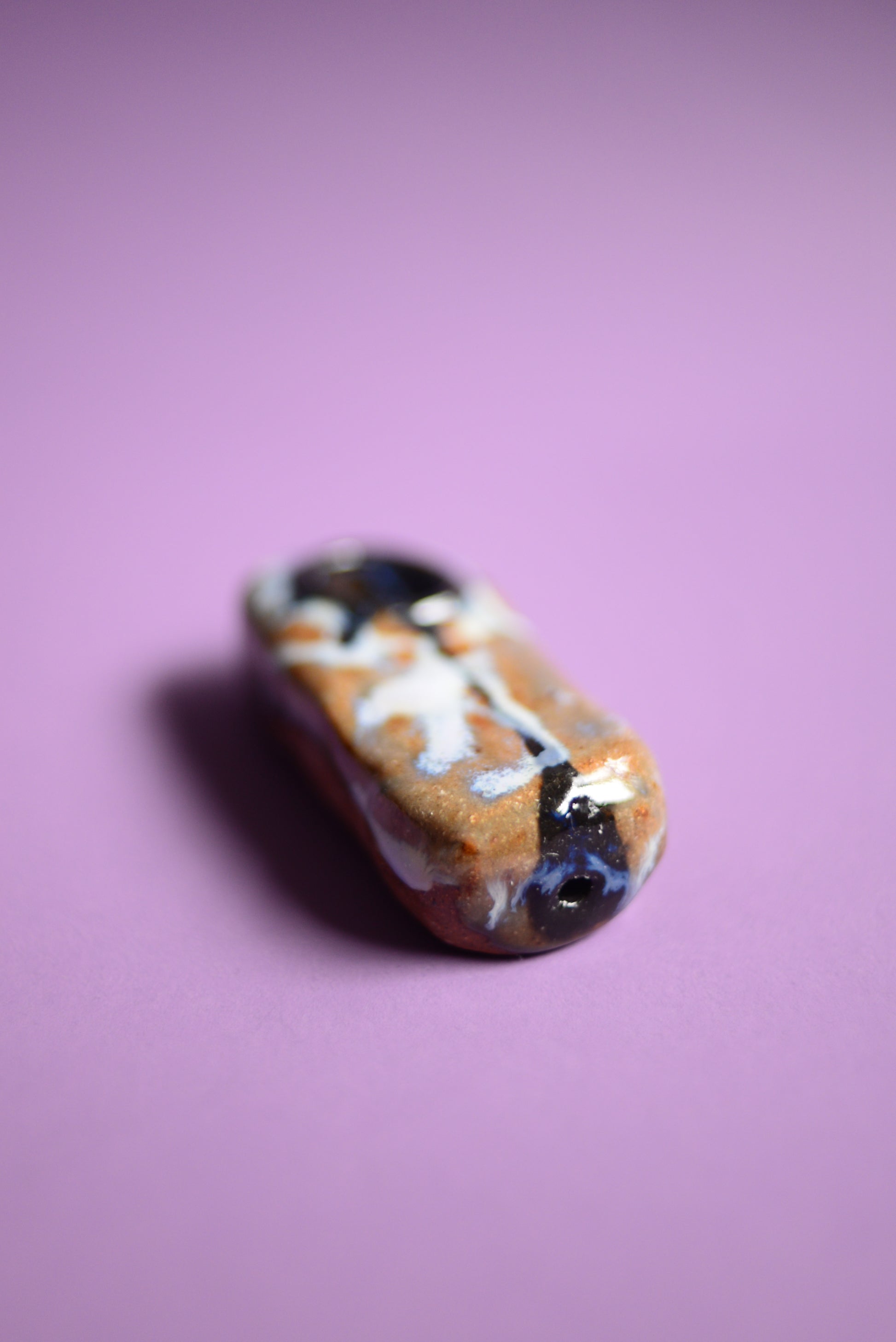 This is a handmade pipe made from brown white stoneware clay. It features an abstract pattern and a choke hole design.